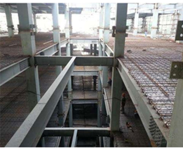 鋼結(jié)構(gòu)柱網(wǎng)間距一般5~9.0m×8~15m,次梁間距3m,而樓承板下料長(zhǎng)度為4.97~8.97m,運(yùn)輸與安裝均較困難,尤其是帶由圓弧區(qū)垂直吊裝樓承板,由上而下在次梁狹間穿套比較困難,且打亂了次梁焊接正常工序。控制下料長(zhǎng)度為3~6m,則可避免垂直運(yùn)輸時(shí)在次梁間無(wú)法吊運(yùn)的問(wèn)題。 樓承板吊運(yùn)時(shí)采用專用軟吊索。每次吊裝時(shí)應(yīng)檢查軟吊索是否有撕裂、割斷現(xiàn)象。樓承板擱置在鋼梁上時(shí)應(yīng)防止探頭。鋪料時(shí)操作人員應(yīng)系安全帶,并保證邊鋪設(shè)邊固定在周邊安全繩上。 焊接采用熔透點(diǎn)焊連接,施焊前應(yīng)準(zhǔn)備邊角料引弧試焊,調(diào)整施焊電流.因樓承板底部無(wú)水平模板及垂直支撐,澆筑混凝土?xí)r布料不宜太集中,采用平板振搗器及時(shí)分?jǐn)傉駬v。